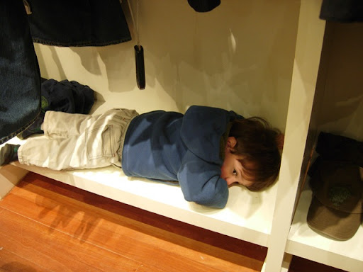 Johnny hiding from the camera on the shelves of Banana Republic.